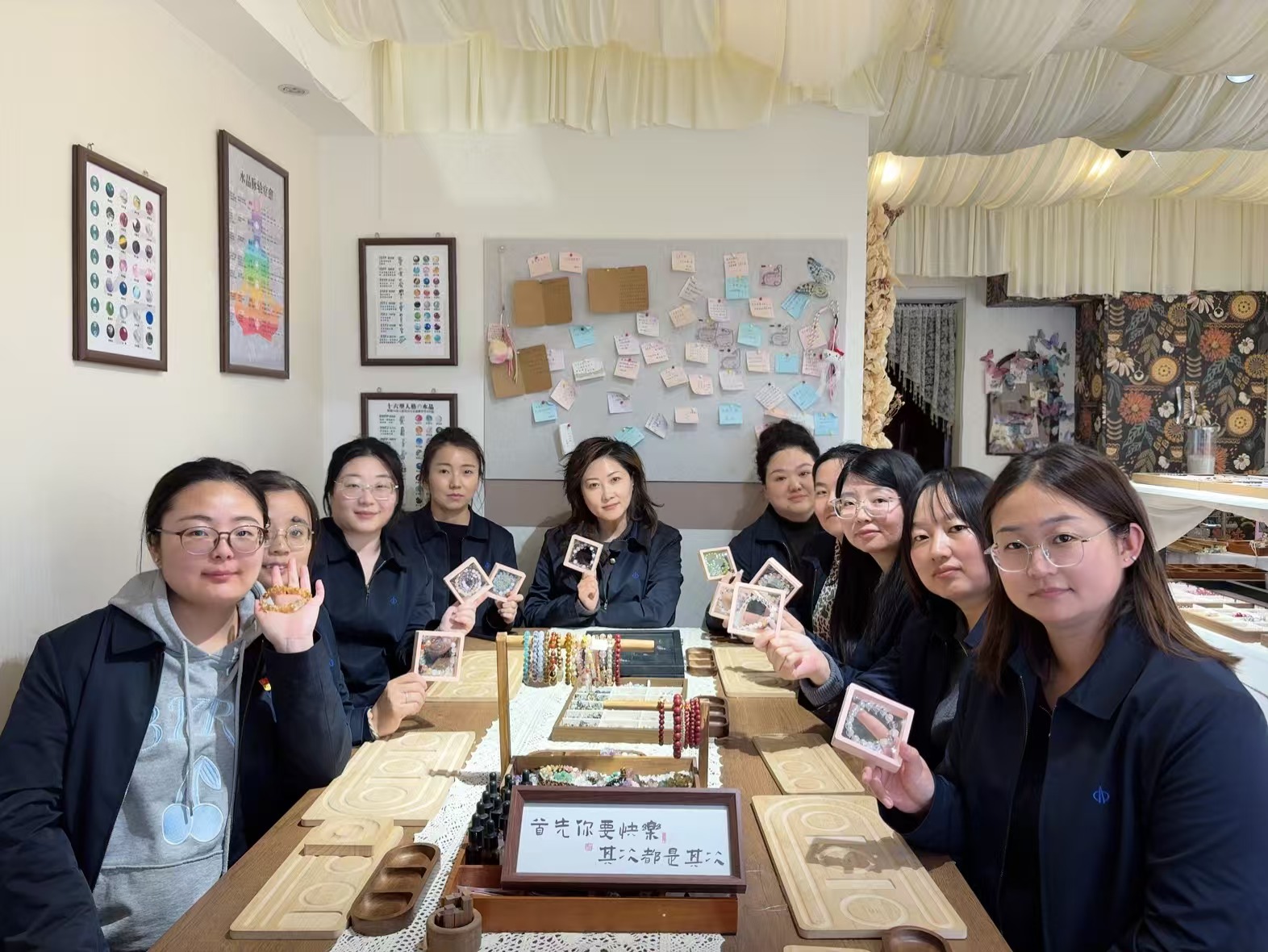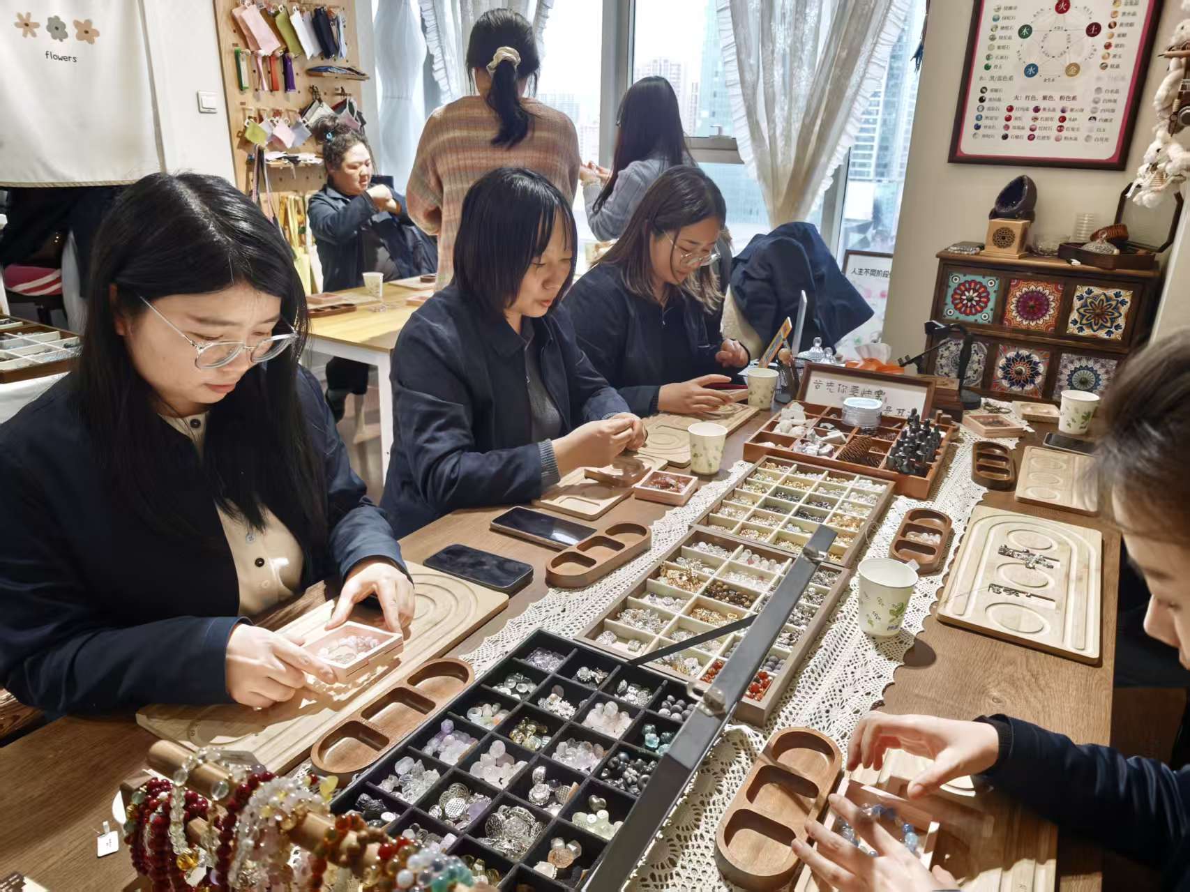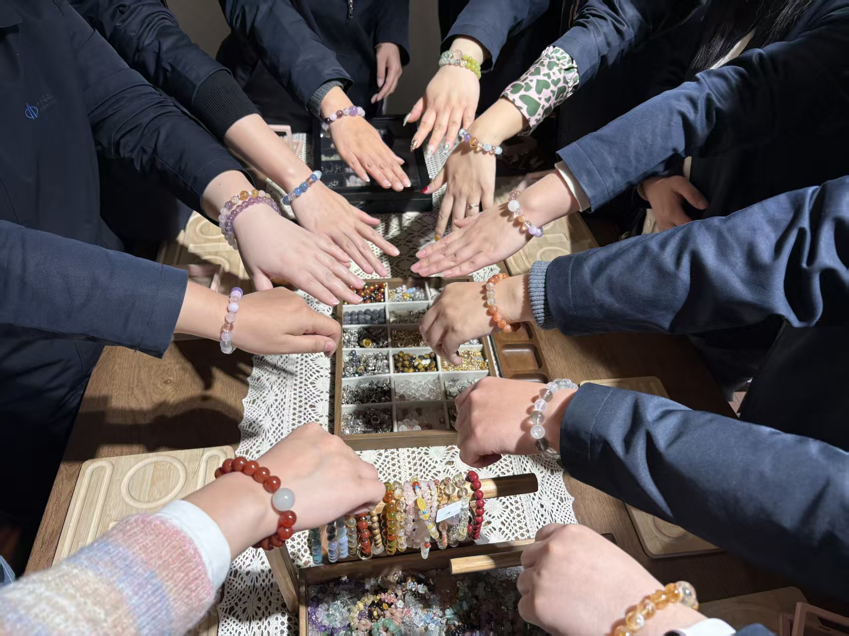 随着水晶珠串DIY环节开启,女职工们迅速投入创作热潮。大家手持串珠引线,专注挑选心仪的水晶珠子,同时与身旁职工交流搭配灵感,将美好期许编织进手串之中。指尖翻飞间,原本零散的珠子逐渐蜕变成为独一无二的专属饰品,每一颗水晶都承载着巧思,每一串手串都凝聚着心意。