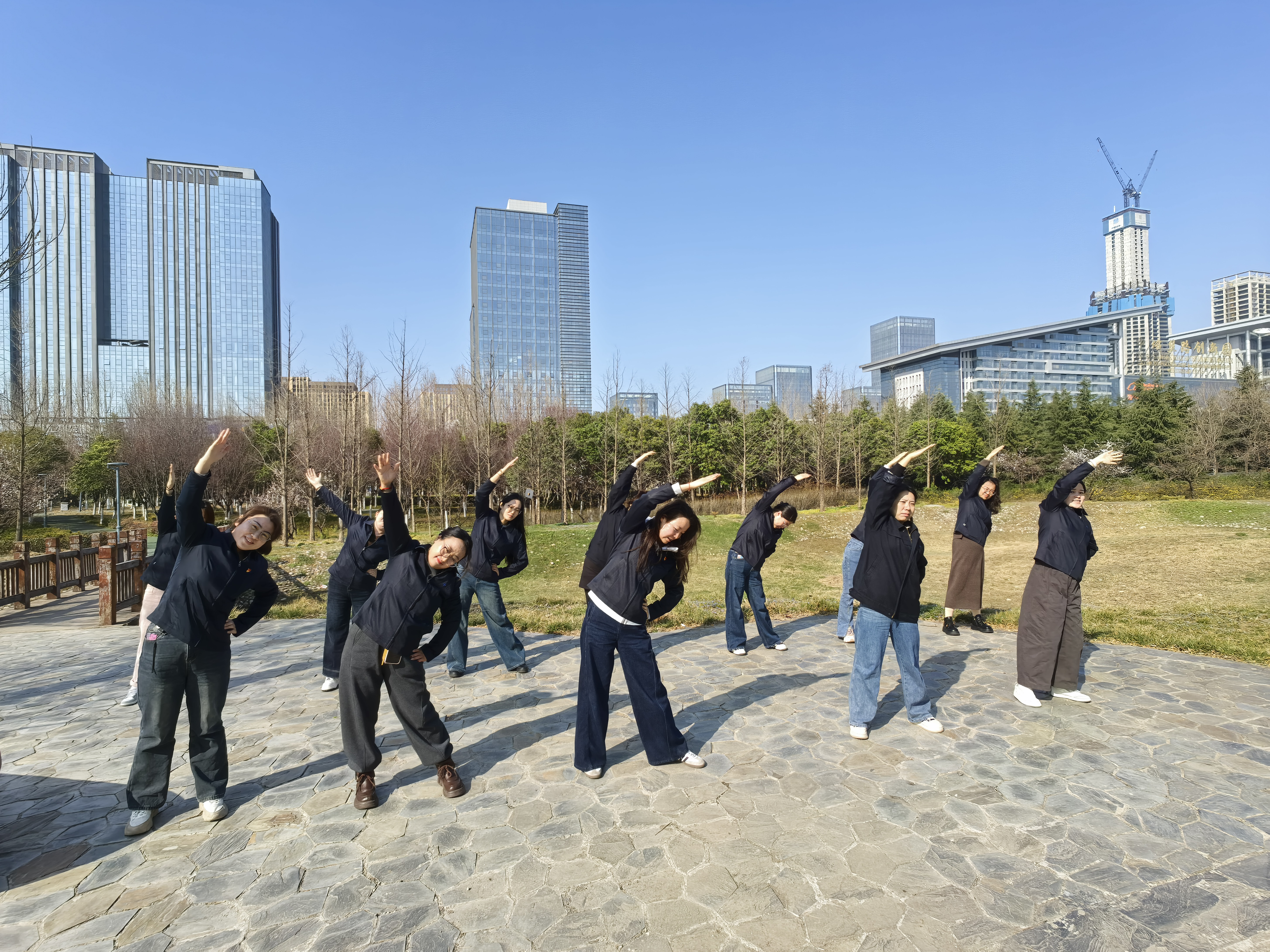 随着轻快的音乐响起,全体职工身着统一工装,精神抖擞、意气风发,认真完成伸展、弯腰、转体、踢腿等规范动作。大家暂时放下繁忙的工作,走出办公区域,在绿意盎然的春日里舒展僵硬的肢体,在整齐划一的动作中感受运动的快乐,缓解工作的疲惫。整齐的队列、规范的动作与春日绿意交相辉映,展现出职工们昂扬向上的精神风貌。
